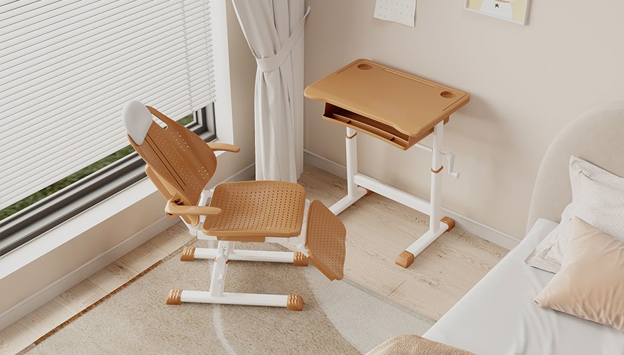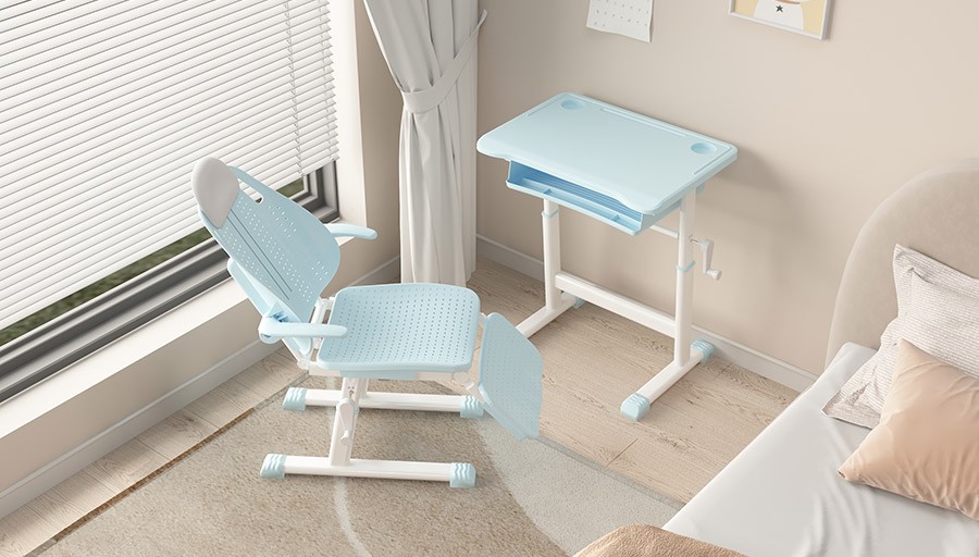 3.功能:靠背上端设有一个宽度263MM高度160(士5MM)的头枕,头枕可活动拉伸,能有效的调整学生身高差距具有合适靠枕位置,靠背壁厚不小于4MM,靠背有透气散热孔,靠背设有大小不一的椭圆透气散热孔,头枕使用环保软包,躺靠舒适,软包头枕采用螺丝固定;造型美观,符合国际安全标准,保护学生脖颈,避免由于不良睡姿而引起的骨位不正;靠背设计有完整的曲线弧度,能很服帖地包覆支撑着正在成长中学童的背部脊椎,使其免于侧弯;